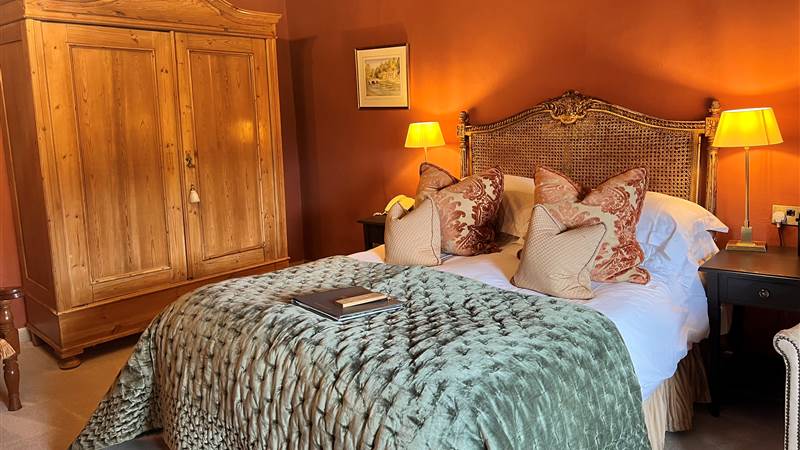 Spacious second floor room with king-size bed. Stylish room in warm russet, heavy soft furnishings and antique pine furniture. Views across frontage to village and then countryside and Oxenber hill beyond. Cream stone tiled en-suite with shower.